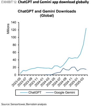 ChatGPT has consistently been one of the top download apps on iOS since the start of the year. A research report from SensorTower & Bernstein also shows the significant gap that has formed between ChatGPT and Google's Gemini: