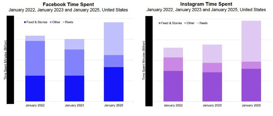The first one shows that Meta's shift in 2022 towards short-form video (Reels) has been the right decision, as it has significantly increased Time Spent on both Facebook and Instagram. I still vividly remember how some users were upset when Meta made the shift, saying that they wanted to see more friends and family content and not 3rd party content, and how they didn't want video, as Instagram is a »photo app. « Well, it turns out Zuckerberg was right again when he said that they are making these decisions based on usage data they are getting from users, and the data spoke volumes, saying people want more 3rd party content and more video.
