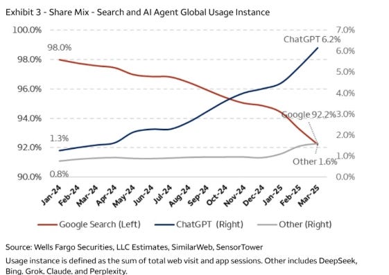 I believe that the usage of Google Search is dropping, but at the same time, the number of queries because of Google's AI overviews and GenAI search might not fall much or fall at all, as users do more searches with LLMs.