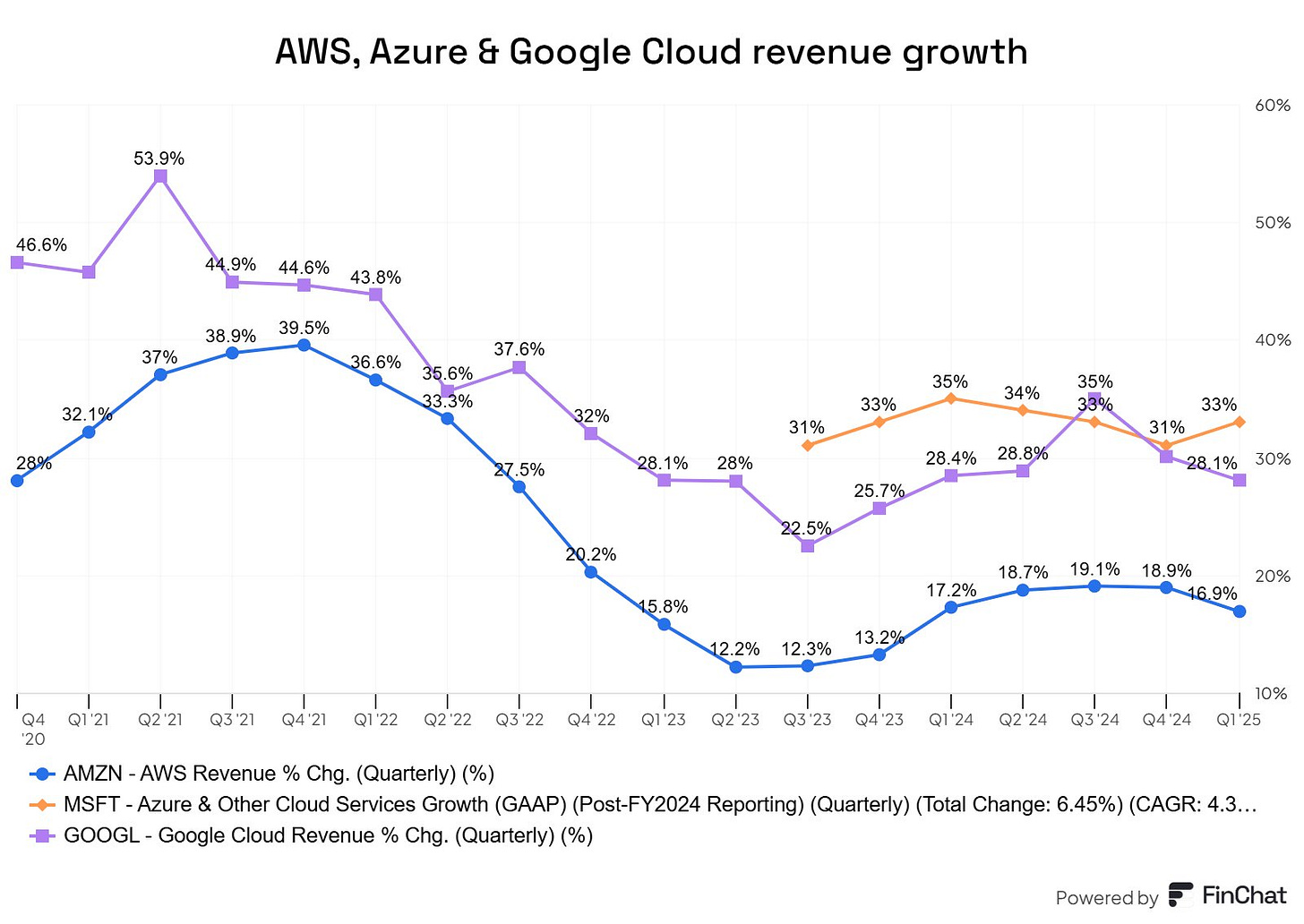 After reviewing earnings results from tech companies, we can compare the progress of all three hyperscalers: Amazon AWS, Google Cloud (note that we don't have exact data on GCP), and Microsoft Azure. An important point of difference this quarter was the acceleration of Azure in contrast to the deceleration of both AWS and Google Cloud.