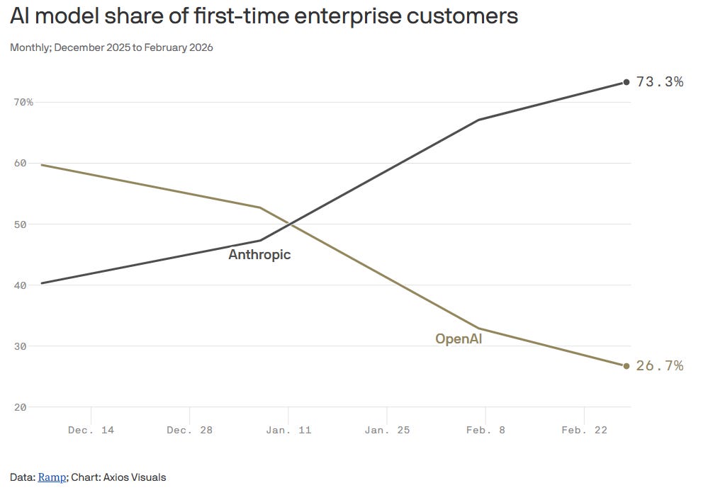 As this data from Ramp shows, the AI model share of first-time enterprise customers has heavily tilted towards Anthropic in the last few months: